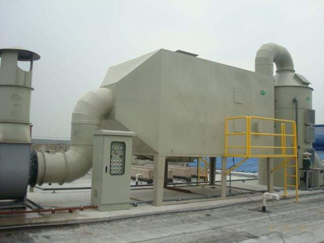 廢氣源→高效吸收塔(吸收掉粉塵以及顆粒物為活性炭和光催化提供優(yōu)良的運行環(huán)境)→活性炭吸附塔(吸附部分苯甲苯二甲苯)→光催化設(shè)備(紫外線照射空氣產(chǎn)生臭氧氧化廢氣分子,利于達標排放)→高壓風(fēng)機(高壓的吸力作用下持續(xù)將廢氣抽出車間)→煙囪高空排放(也可低空排放)。